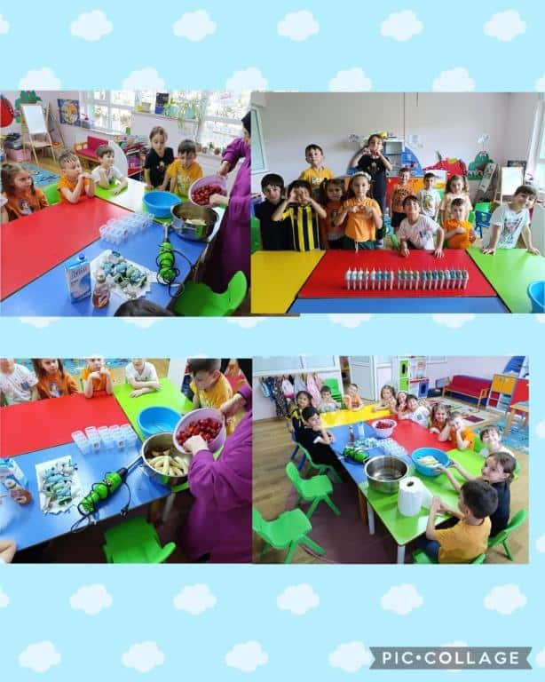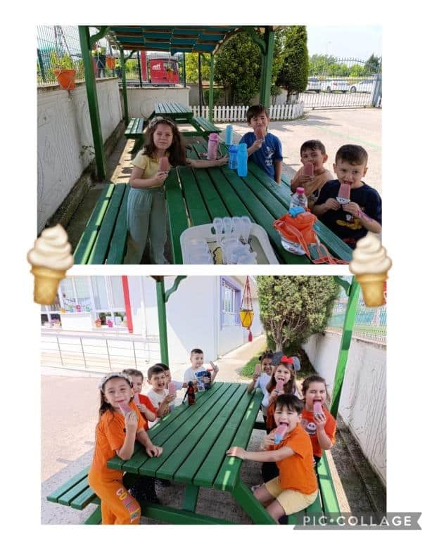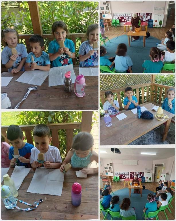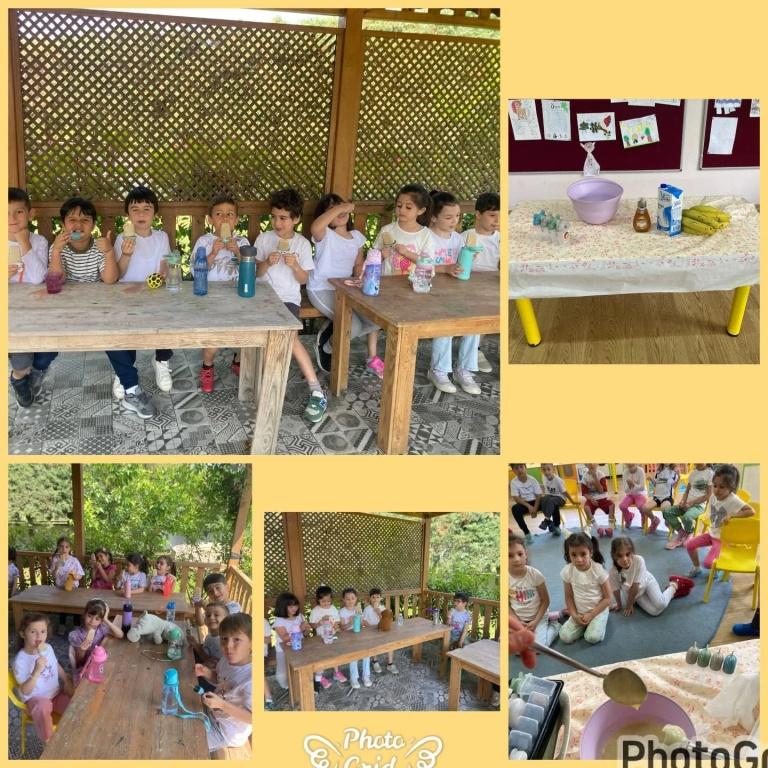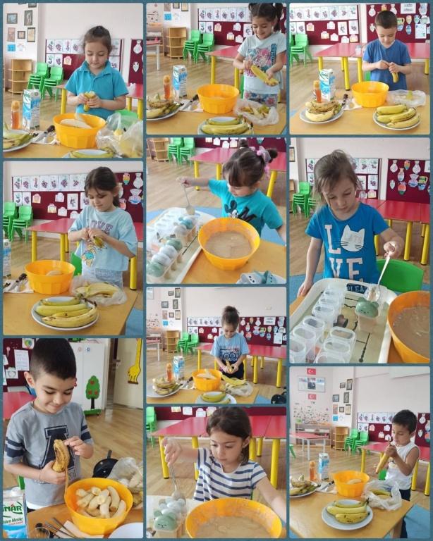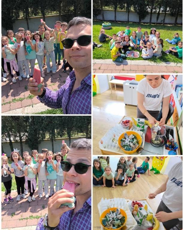 Okul Sağlığı projesi ve mevcut diğer çalışmalarımızın kesiştiği konulardan birisi 'Sağlıklı Beslenme'. Çocukların paketli gidalara düşkün olması boşuna değil; paketleri janjanlı, reklamları ilgi çekici, içleri tatlandırıcı, koruyucu, renklendirici, doymuş yağ ve MSG(Çin Tuzu) gibi onlarca madde dolu. Bunların bazıları bağımlılık oluşturan bazıları ise hormon yapısını hatta direkt beyni etkileyen maddeler. Cocuklarla birçok ürünün ambalajını sinifta inceleyerek 'İÇİNDE NE VAR?' etkinliği gerçekleştirildik ve ürünlerin icindeki maddelerin uzerlerinde yazmak zorunda olduğunu, içeriklerini okumaları gerektiğini, koyulan maddelerin etkilerini ve koyulma sebeplerini konuştuk. Ayrıca tüketen değil üreten bireyler olmaları konusunda her fırsatı degerlendirdiğimiz oğrencilerimizle sınıflarımızda YALNIZCA MEYVE, SÜT VE BAL kullanarak dondurmalar yaptık ve ertesi gün yemek üzere kalıplarla dondurucuya gönderdik. Sağlığımız ocin fiziksel aktivite ve temiz hava gerekliliğine de vurgu yaparak dondurmalarımızı okulumuzun bahçesinde keyifle tükettik. Evlerinde 'anne dondurma yapalım', 'anne kendi kurabiyemizi, turşumuzu yapalım' taleplerinile anne-babaları sıkıştıran ogrencilerimizi duymaktan gurur duyduk.